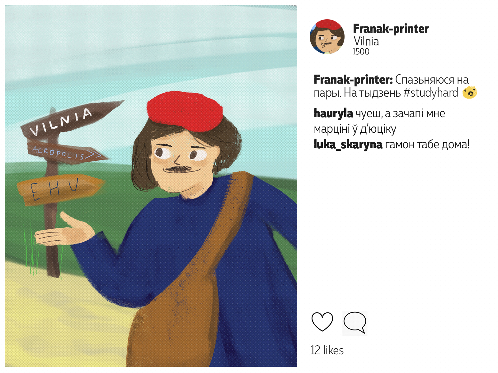 Францішак Скарына падарожнічаў ня менш за каторага сучаснага маладзёна. Ураджэнец Полацку, ён аб'ехаў палову Эўропы*: ад Вэнэцыі да Масквы. Пакінуў сьлед ва ўнівэрсытэтах Польшчы і Вэнэцыянскай рэспублікі, пры каралеўскіх дварах Даніі і Чэхіі. У Познані ён адседзеў у астрогу, а з Саксоніі ад яго ўцякаў Марцін Лютэр. Мы падумалі, што Скарына абавязкова карыстаўся б сацсеткамі. І вось як мог бы выглядаць ягоны інстаграм.
