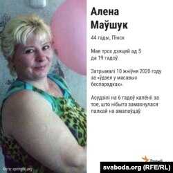 Алену затрымалі пасьля пратэстаў у Пінску ноччу 10 жніўня. Па словах сукамэрніцы, яе пасадзілі «голую, босую, зьбітую», на целе ў Маўшук былі сінякі. Яе паставілі на ўлік як «схільную да захопу адміністрацыі і праяваў агрэсіі». Мужа Алены Сяргея таксама асудзілі на 6,5 года зьняволеньня. Пасьля прысуду яго ўзялі пад варту, дагэтуль ён заставаўся на волі.